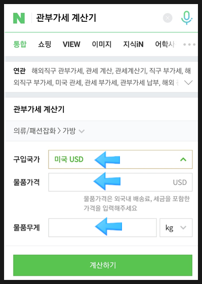 - 관부가세 계산기 검색 : 네이버에 "관부가세 계산기"를 검색합니다.
