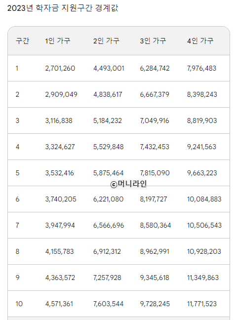 매년 보건복지부에서 발표하는 기준 중위소득과 연계하여 학기 단위로 경계값이 조정됩니다. 아래는 2023년 기준 소득분위 구간표 입니다.