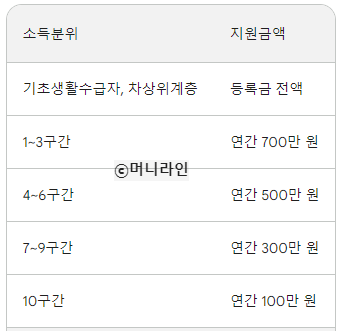 - 소득분위 1구간 학생의 경우, 연간 700만 원의 장학금을 지원받습니다.