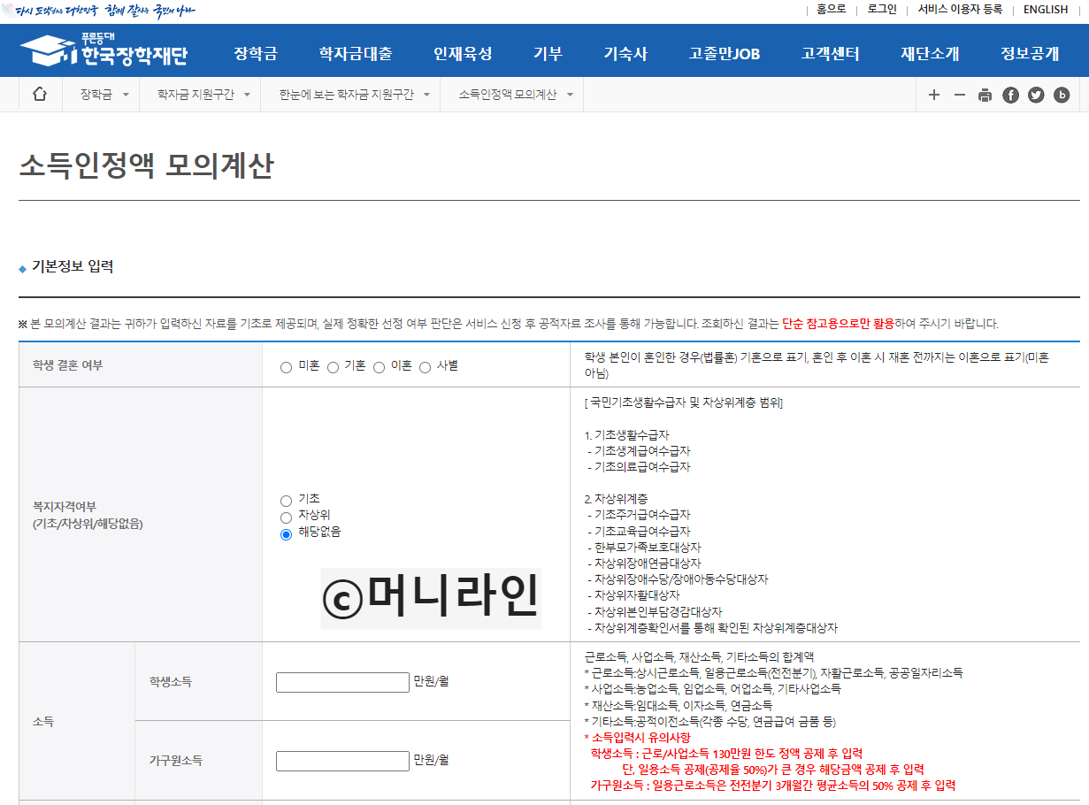한국장학재단 홈페이지에서는 복잡한 소득인정액 계산을 보다 간편하게 계산할 수 있게 아래와 같이 학자금 지원구간 및 소득인정액 모의계산 서비스를 제공하고 있습니다.