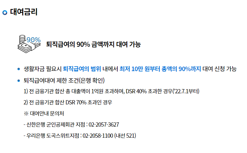 군인 퇴직금 담보대출, 금리 5%, 한도 퇴직금의 90%까지