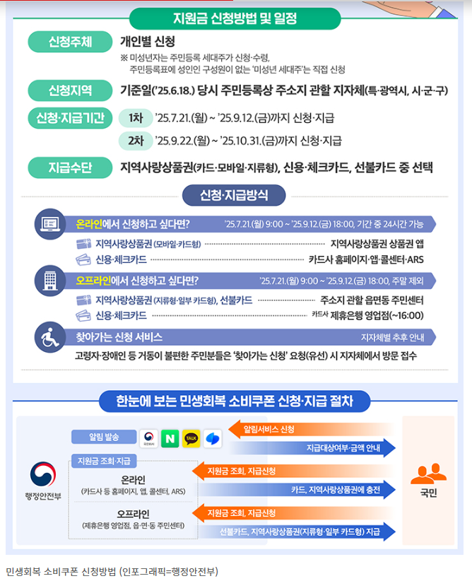 - 또한 거동이 불편한 고령자 등 접근성이 낮은 국민의 편의를 위해 해당 지방자치단체에서 직접 방문해 신청을 접수하고 소비쿠폰을 지급하는 '찾아가는 신청'도 운영해 사각지대 관리에 소홀함이 없게 준비할 예정이다.