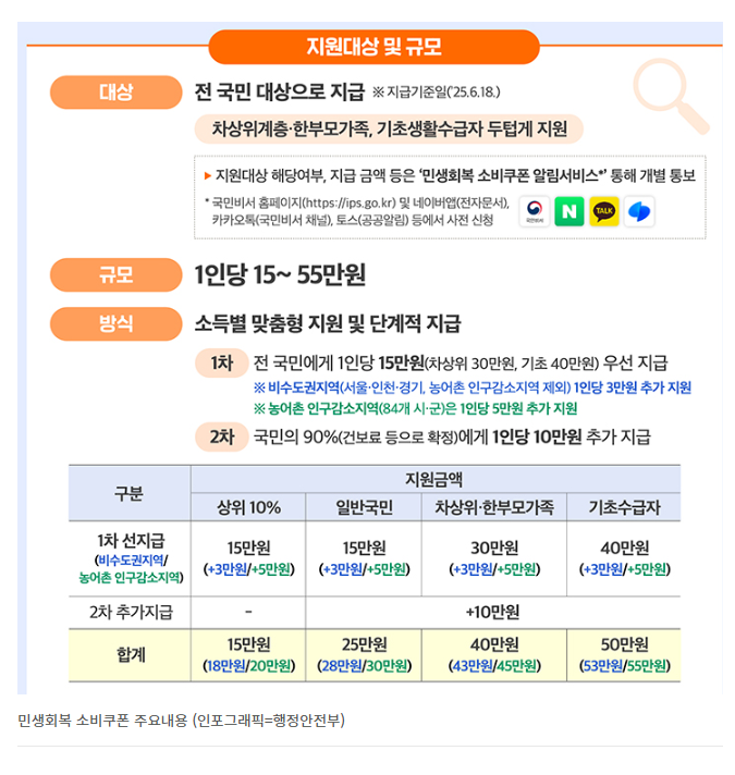 [1] 전 국민에 '민생회복 소비쿠폰' 15만 원~45만 원 지급…7월 21일부터 <자료출처=정책브리핑 http://www.korea.kr> (https://www.korea.kr/news/policyNewsView.do?newsId=148945532&pWise=main&pWiseMain=A1)