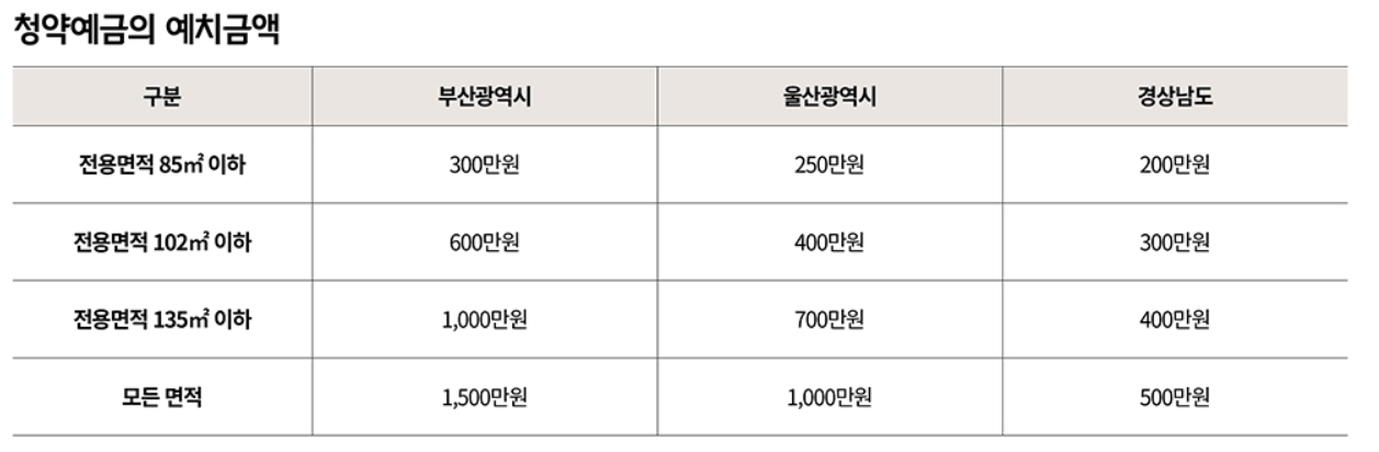- 청약 예치금: 전용 85㎡ 이하 부산 300만 원, 울산/경남 200만 원