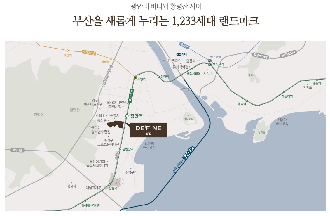 드파인 광안은 2호선 광안역 역세권에 위치하여 센텀, 서면 등 주요 지역으로의 접근성이 뛰어납니다. 또한, 호암초, 수영중, 동아중 등 우수한 학군을 갖추고 있어 자녀 교육에도 좋은 환경입니다.