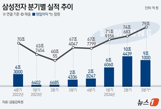 삼성전자는 2024년 3분기 연결 기준으로 매출 79조 원, 영업이익 9.1조 원을 기록했습니다. 이는 전기 대비 매출이 6.66% 증가한 수치입니다. 이러한 성장은 글로벌 반도체 시장의 회복세와 함께 삼성전자의 다양한 사업 부문에서의 성과가 반영된 결과로 보입니다.