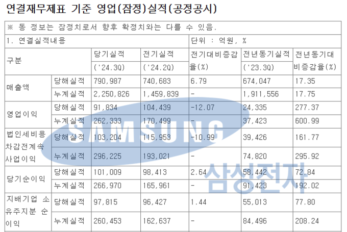 [FETV=양대규 기자] 삼성전자는 연결 기준으로 매출 79조987억원, 영업이익 9조1834억원의 2024년 3분기 실적을 31일 발표했다. 전사 매출은 전분기 대비 6.79% 증가했으며, 전년 같은 기간보다 17.35% 늘