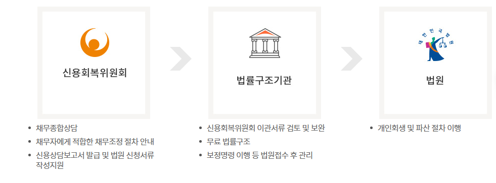 - 신용회복위원회 상담소 또는 법률구조공단을 방문하여 상담을 받습니다.