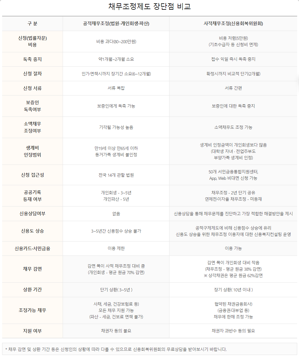 국가기관인 신용회복위원회에서 운영하는 사적 개인채무제도인 신속채무조정, 사전채무조정, 개인워크아웃도 있습니다. 그럼 이제, 공적 채무조정과 사적 채무조정의 장단점을 비교해보겠습니다.
