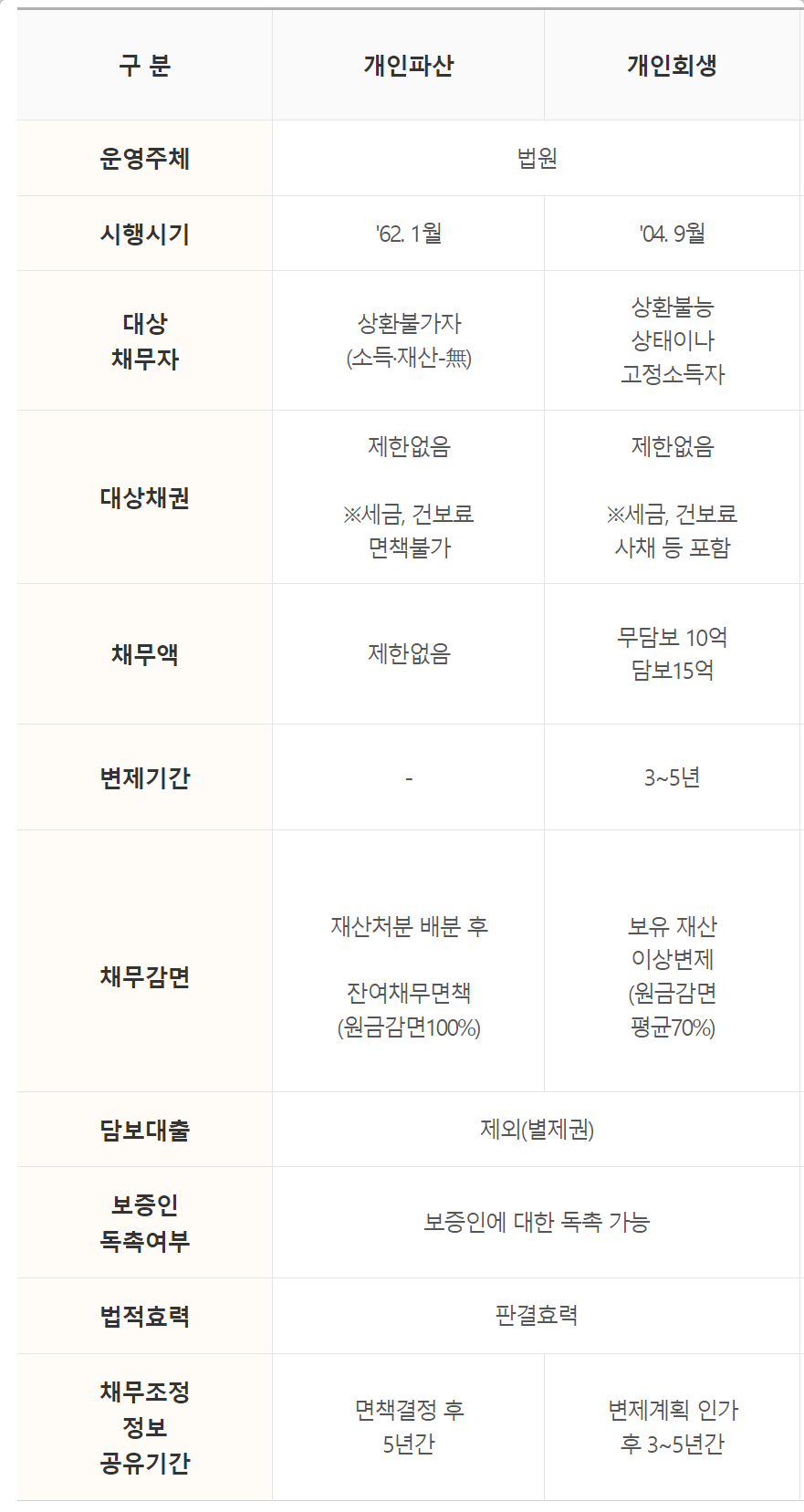 또한, 공적채무조정인 개인파산과 사적채무조정인 개인회생의 차이점은 아래와 같습니다. 비교해 보시고 본인에게 적합한 제도를 찾아보세요.