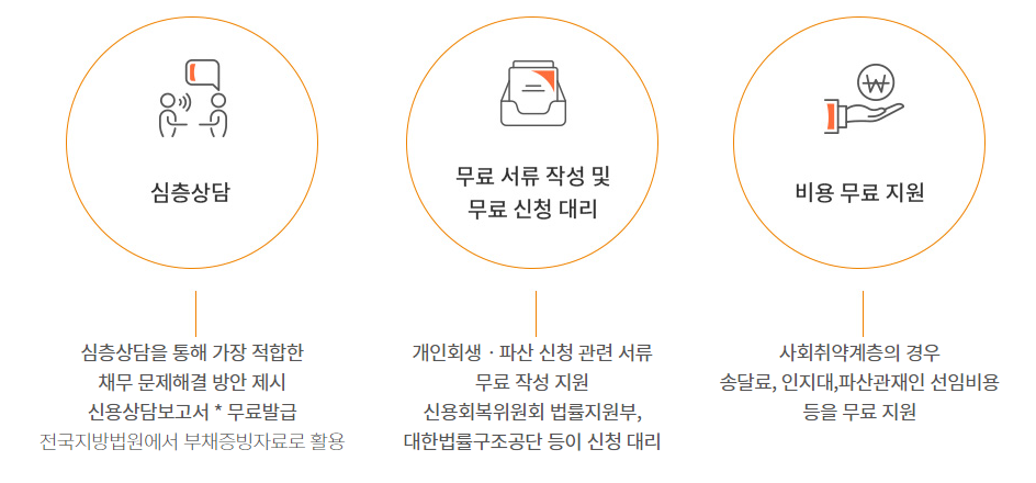 지원절차는 신용회복위원회 상담 및 서류작성 → 법률구조기관 접수 관리 → 법원 절차 이행의 순으로 진행됩니다.