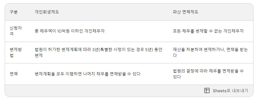 개인회생제도와 파산/면책제도는 아래와 같은 주요 차이점이 있습니다.