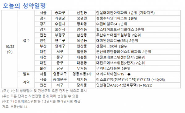 부동산 정보업체 부동산R114에 따르면 23일인 오늘은 서울 송파구 ‘잠실래미안아이파크’(기타지역) 1순위 청약을 받는다.경기 오산시 ‘힐스테이트오산