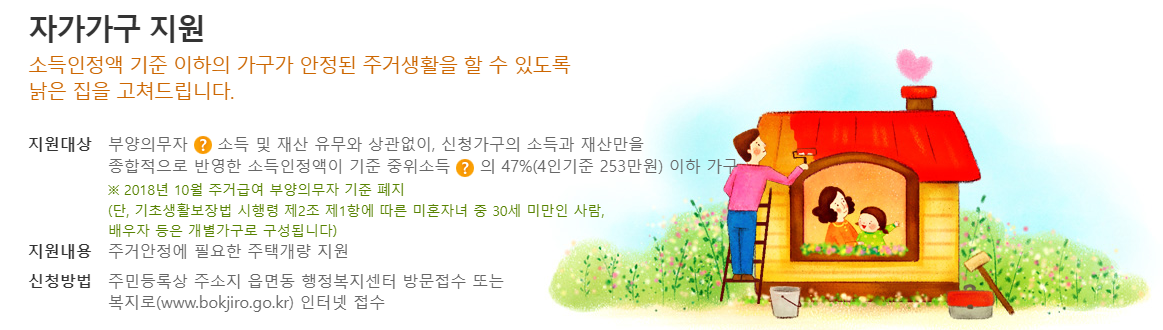 자가가구는 주택 노후도에 따라 수선 유지 급여를 지원합니다.