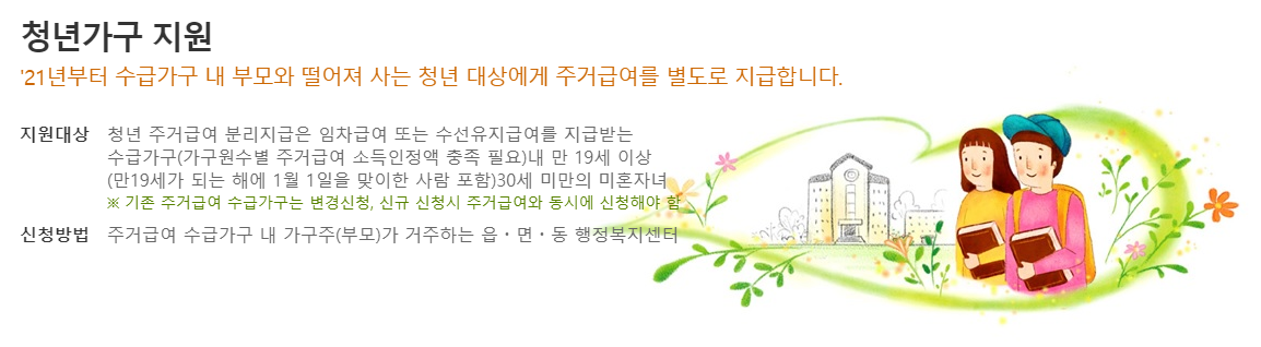 3) 청년가구 : 수급가구 내 부모와 떨어져 사는 청년 대상에게 주거급여를 별도 지급