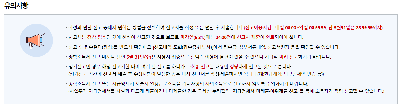 - 홈택스 접속 후 [세금신고 > 종합소득세 신고 > 근로소득 신고 > 정기신고 작성]