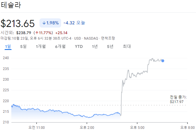 실적 발표 후 테슬라의 주가는 시장에서 긍정적인 반응을 보였습니다. 발표 직후 주가는 1.98% 하락했으나, 이후 반등하여 안정세를 찾았습니다. 현재 주가는 213.65달러로, 최근 한 달 간의 변동성을 나타내고 있습니다.
