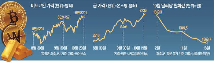 3대 자산 가격 최근 폭등 코인규제완화 발언 나오자 비트코인 값 1주새 14% 상승 안전자산 금·달러값도 올라 강달러에 원화 더 하락할수도 “추가 하락 길진 않을 것”