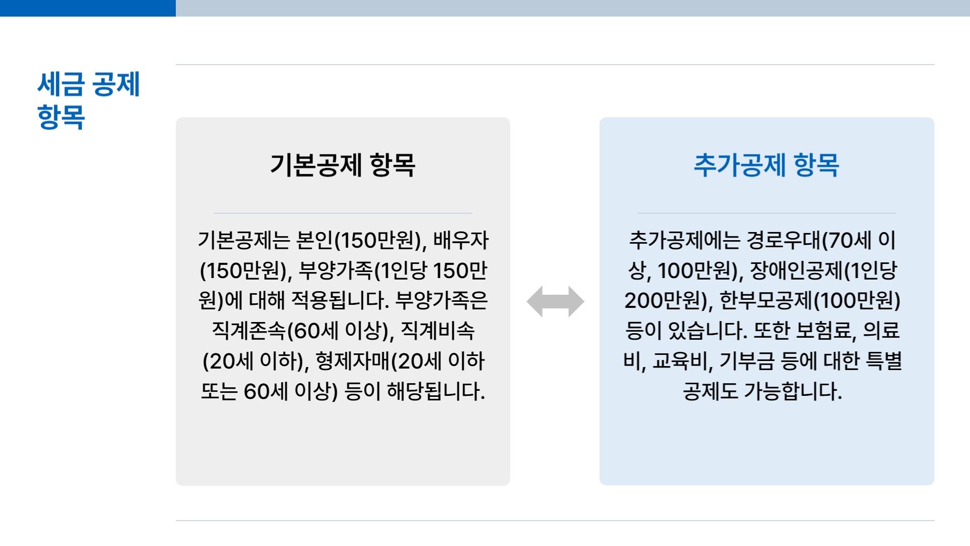 - 추가공제: 경로우대(만 70세 이상), 장애인 공제 등.