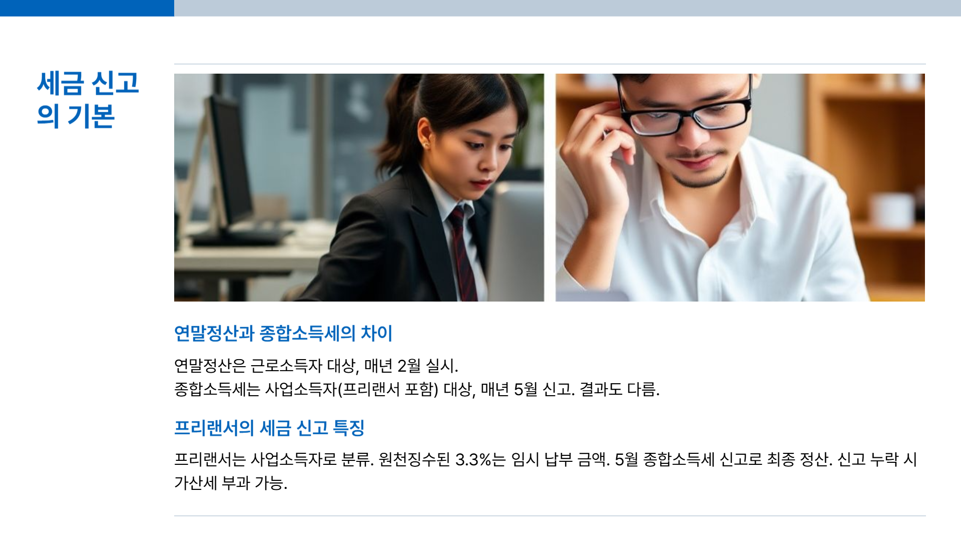 프리랜서의 세금 관리는 복잡하지만 중요합니다. 연말정산 대신 종합소득세 신고를 해야 하며, 3.3% 원천징수 환급, 필요경비 활용, 공제 항목 적용 등으로 절세가 가능합니다. 정확한 신고와 꾸준한 기록 관리로 세금 부담을 줄이고 재정 안정성을 높이세요.