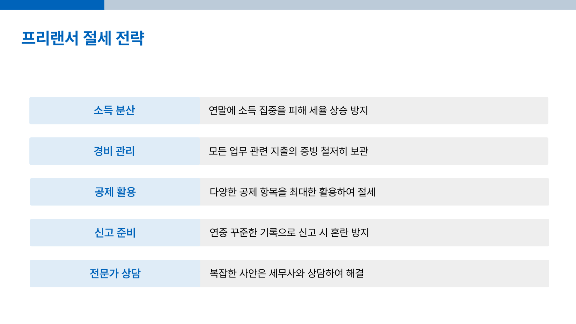 이 항목들은 공제 가능한 범위 내에서 최대한 활용하는 것이 절세의 핵심입니다.