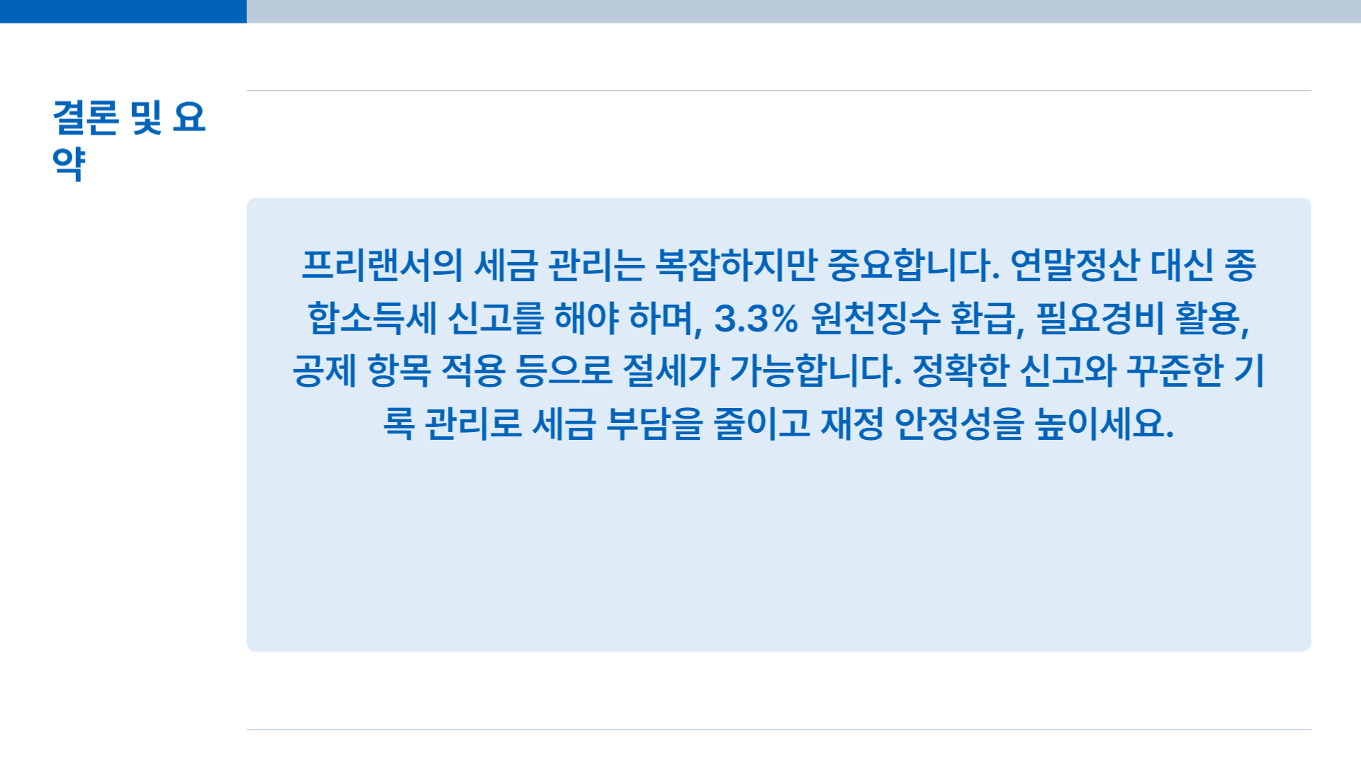 프리랜서의 세금 관리는 복잡하지만 중요합니다. 연말정산 대신 종합소득세 신고를 해야 하며, 3.3% 원천징수 환급, 필요경비 활용, 공제 항목 적용 등으로 절세가 가능합니다. 정확한 신고와 꾸준한 기록 관리로 세금 부담을 줄이고 재정 안정성을 높이세요.