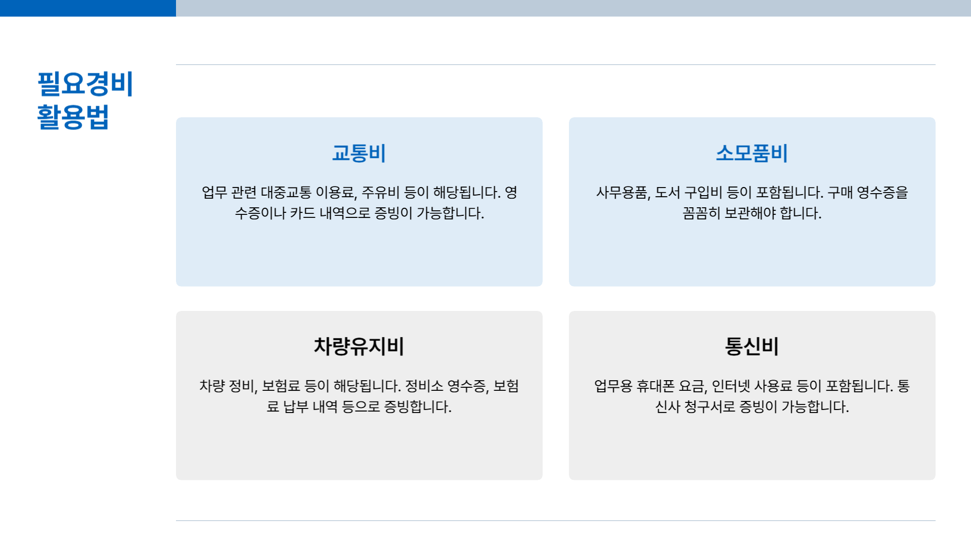 | 차량 유지비 | 인정 | 정비소 영수증, 주유 영수증 |