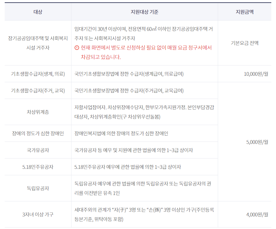 - 장기공공임대주택 및 사회복지시설거주자: 기본요금 전액 (별도 신청 필요 없음)
