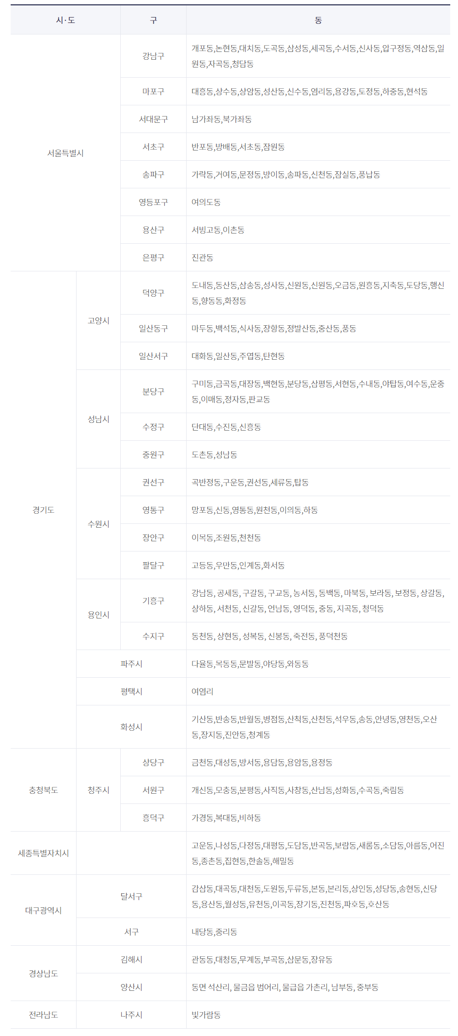 위 표는 이해를 돕기 위한 것으로, 해당 지역에 속하더라도 한국지역난방공사에서 지역난방을 공급하지 않는 아파트, 건물 등이 있습니다. 자세한 공급지역 여부는 고객센터(1688-2488)로 연락하시어 자세한 안내를 받으시기 바랍니다.