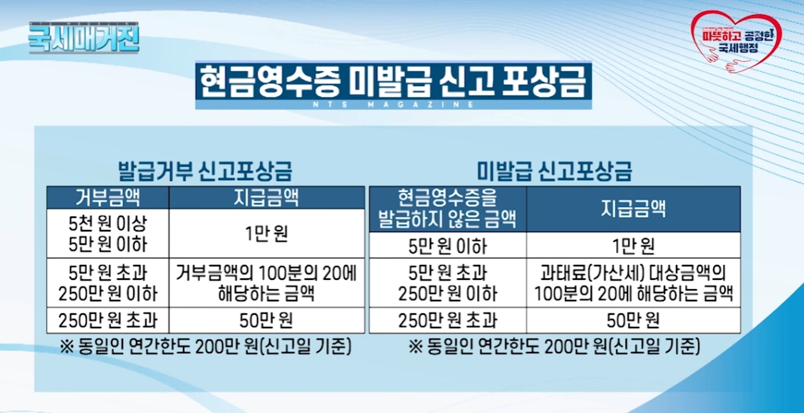 - 현금 영수증 발급 의무 업종임에도 현금 영수증 미발급 시에는 가산세 또는 과태료가 부과됩니다.
