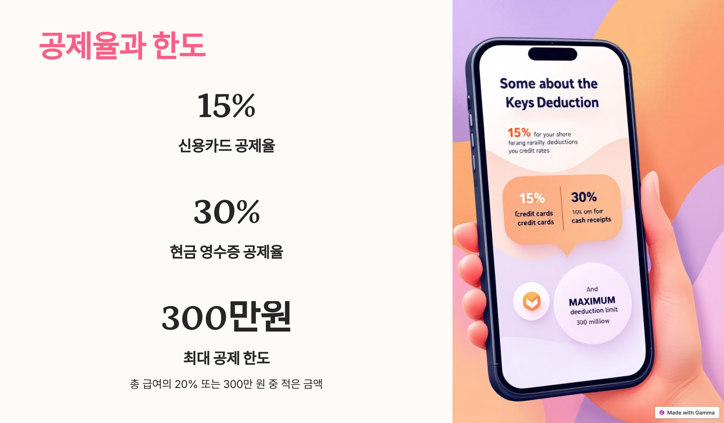 - 한도: 총 급여의 20% 또는 300만 원 중 적은 금액.