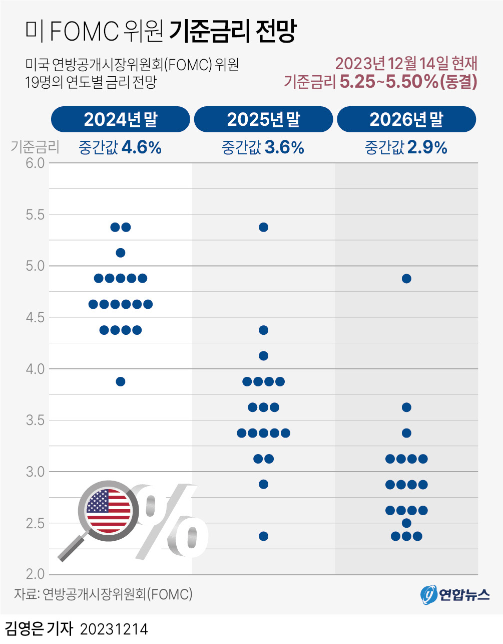 美, 기준금리 5.25∼5.50% 동결…내년 세 차례 금리 인하 예상(종합2보) | 연합뉴스