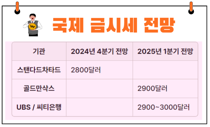 여러 금융기관에서는 2025년 금 가격에 대한 전망을 내놓고 있습니다. 예를 들어, 스탠다드차타드, 골드만삭스, 및 UBS/씨티은행은 각각 2025년 금 가격을 2800달러에서 3000달러 사이로 예상하고 있습니다. 이들은 지정학적 긴장과 인플레이션 등의 요인이 금 가격에 긍정적인 영향을 미칠 것이라고 분석하고 있습니다.