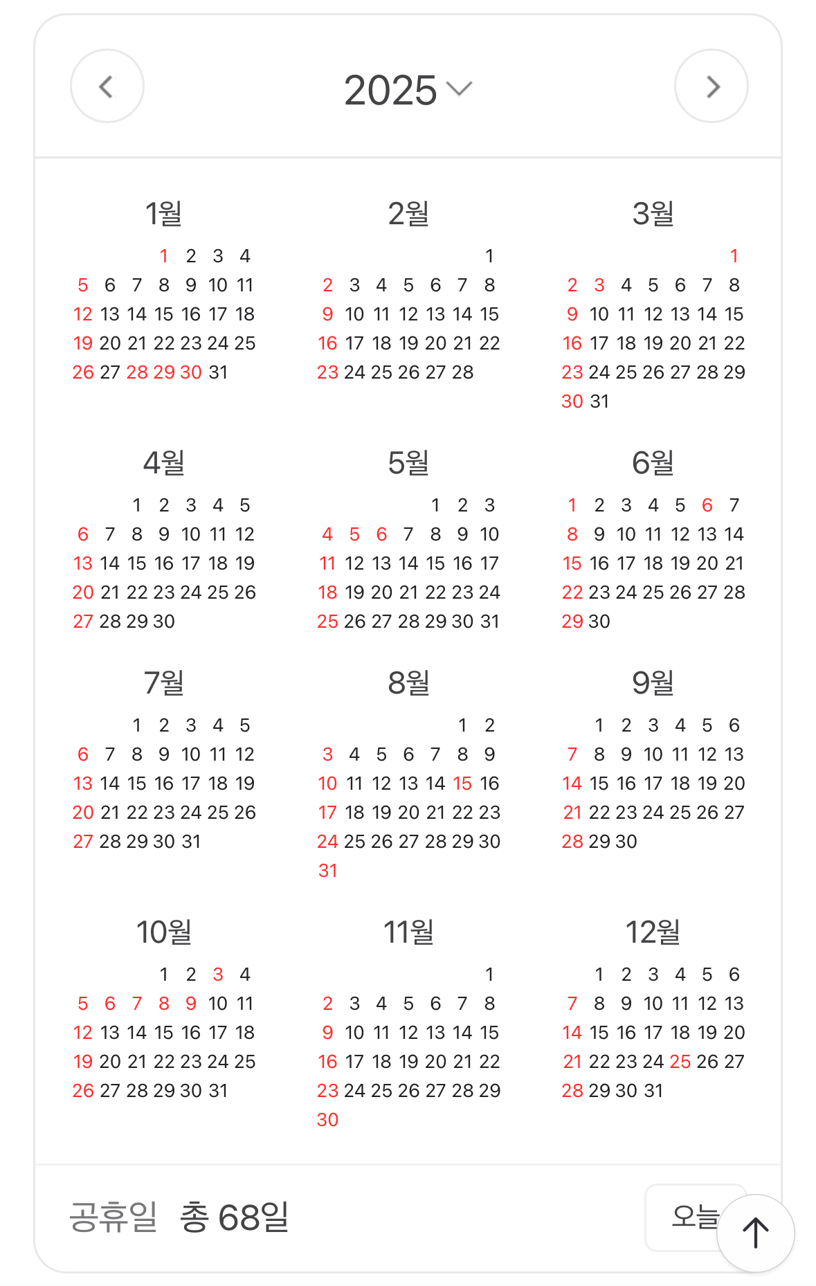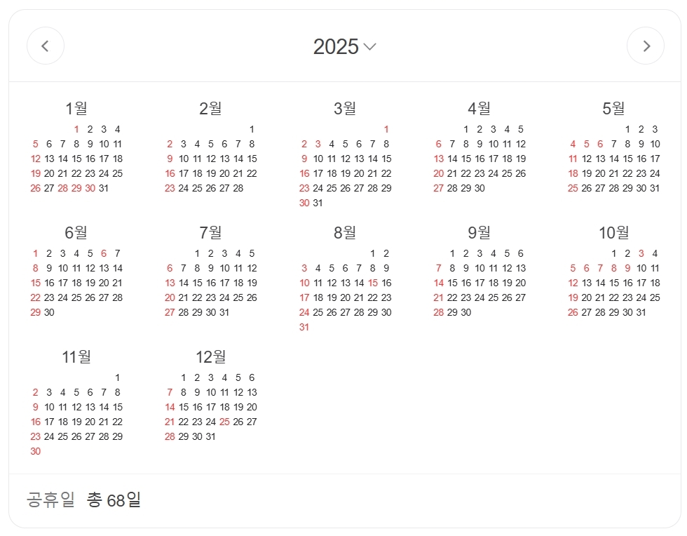 2025년은 총 12개월로 구성되어 있으며, 각 월마다 다양한 공휴일과 특별한 날들이 있습니다. 특히, 2025년은 공휴일이 총 68일로 예년보다 많이 포함되어 있어 연휴를 활용하기 좋은 해입니다.