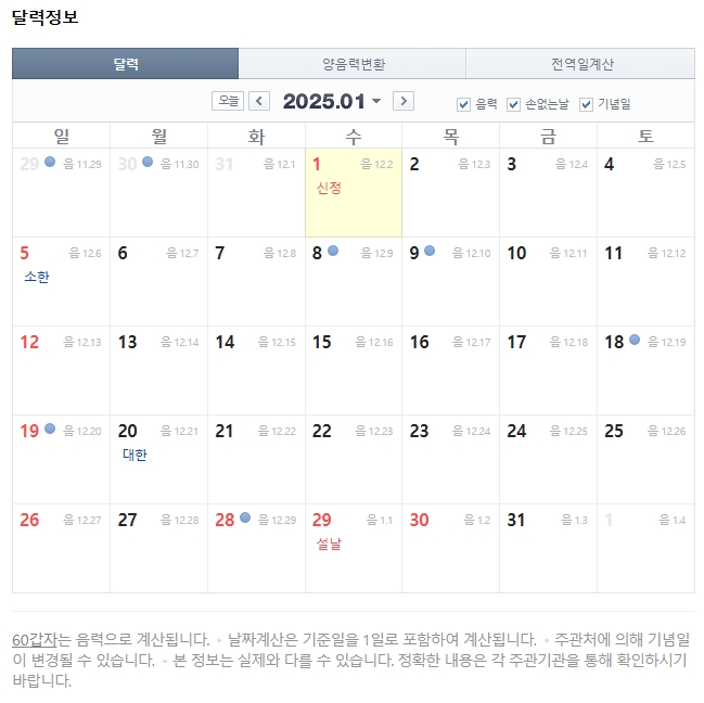 2025년 달력 활용 팁 (음력달력, 손없는 날)