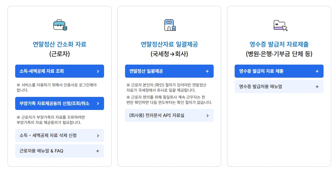 [2] 국세청 - 연말정산 종합 안내 (https://www.nts.go.kr/nts/cm/cntnts/cntntsView.do?mi=2304&cntntsId=238938)
