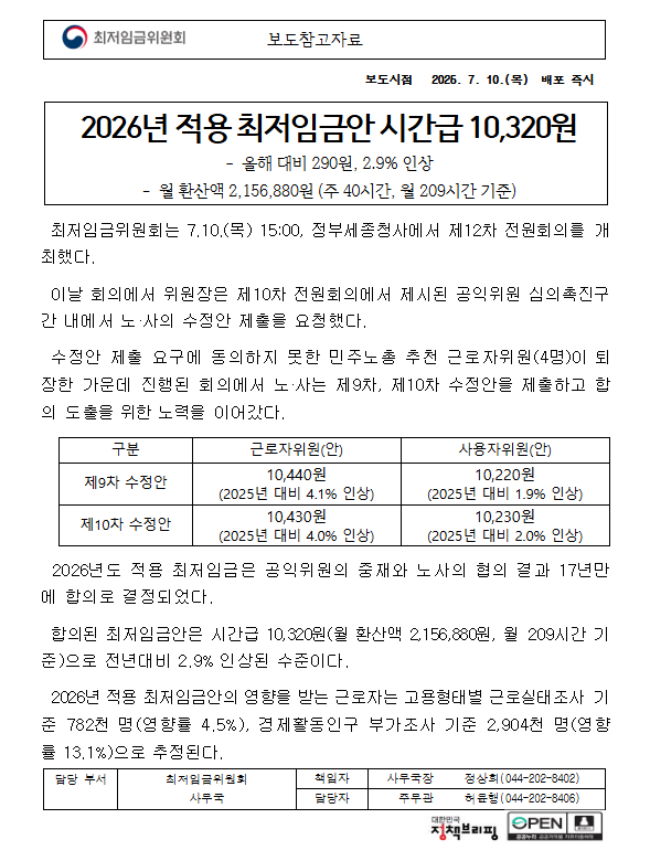 - 2026년 최저임금 시간급 10,320원이 확정되면서, 올해보다 얼마나 오르는지, 그리고 이 금액이 내 생활에 어떤 영향을 미칠지 자세히 알려드려요.