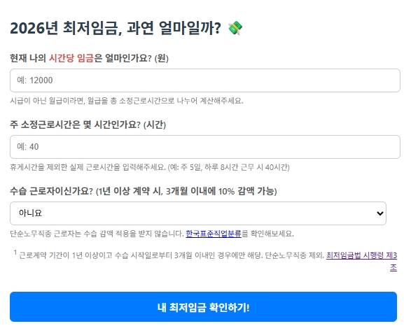 태그: #2026년최저임금, #최저시급, #월급계산, #연봉계산, #실수령액, #최저임금위원회, #고용노동부, #최저임금법, #노동자권리, #임금인상, #직장인필수정보, #재테크시작, #알바월급, #소득증가, #경제뉴스