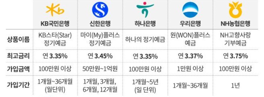 목돈을 한 번에 맡기고 안정적인 이자를 얻고 싶다면 정기예금이 제격입니다. 5대 은행의 정기예금 상품 중 최고 금리는 3.75%로, 농협은행의 'NH고향사랑기부예금'이 가장 높습니다. 신한은행, 우리은행, 하나은행, 국민은행 등 다른 은행들도 3.35%~3.45%의 금리를 제공하며, 우대금리 조건을 충족하면 추가 금리를 받을 수 있습니다.