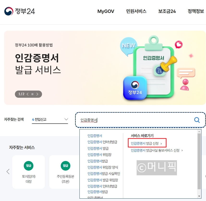 - 검색창에 '인감증명서 발급 신청'을 입력 후 해당 메뉴로 이동합니다.