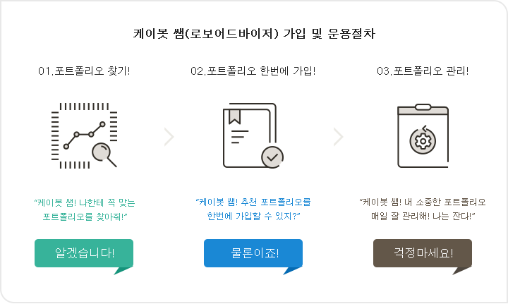 KB국민은행은 고객이 쉽게 자산을 관리할 수 있도록 케이벗 쌤이라는 로보어드바이저 서비스를 제공합니다. 이 서비스는 고객이 자신의 투자 성향에 맞는 포트폴리오를 찾고, 가입 후 관리할 수 있도록 돕습니다. 사용자는 간단한 단계로 포트폴리오를 설정하고 관리할 수 있습니다.