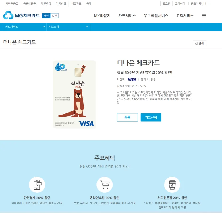 [1] MG체크카드 - 혜택 - MG체크카드 - 새마을금고 (https://mgcheck.kfcc.co.kr/pers/appl/persTheNaeunGuid.do)